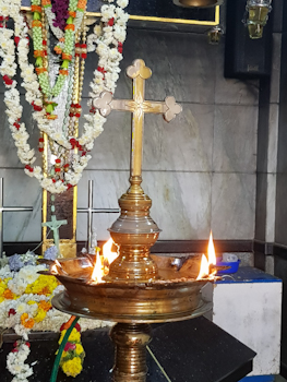 I saw a brass diya stand with burning oil lamps directly in front of the crucifix. Like the lamp stand by the entrance, this one was also topped with a Christian cross.