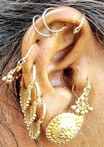 Many of these passengers in rural areas wore traditional costumes typical of the area where they lived. In Saurashtra, many of the women wore tight fitting backless choli (blouse), which are covered by shawls that fly about as draughts are created by the moving bus. Their ears are often festooned with weighty and often complicated solid gold jewellery. They are usually heavily tattooed, with tattoos placed on all parts the body that were visible.
