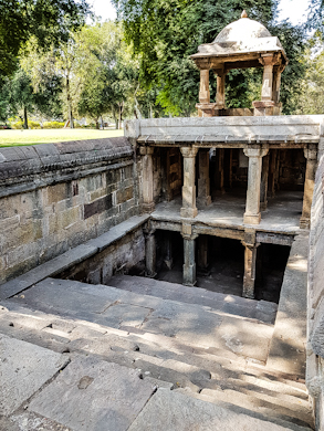 The windows at the back of the palace look out over formal gardens with dried up water features including a slender stone-lined channel running between bare rectangular patches of ground and fountains. We climbed a spiral staircase to reach the roof of the palace and wandered amongst the domed pavilions with jali screens covering their windows. Another spiral staircase, made of cast-iron, leads to an elevated viewing platform covered with a large domed ceiling supported by pillars. From here, we had a wonderful view of the countryside surrounding the palace and the Arabian Sea.“